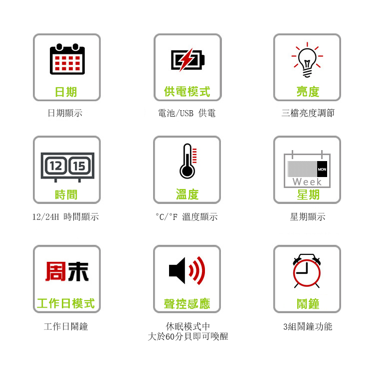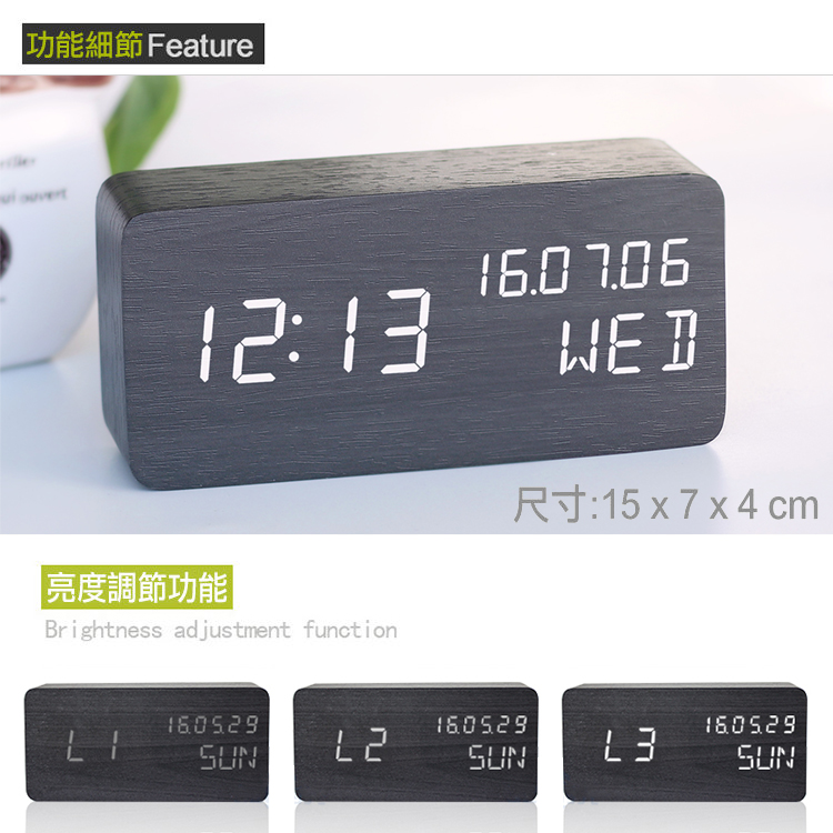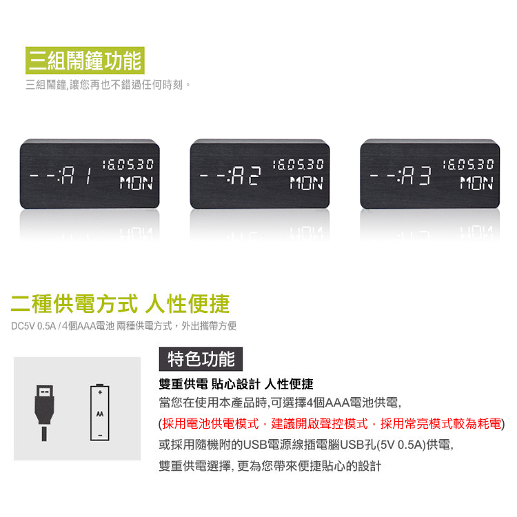 木頭造型和紋理將大自然的氣息帶進居家、辦公室,享受自然的寧靜,實用與簡約外觀完美融合!! 【LED燈數字顯示】 三種亮度調節功能,柔和的LED燈光,即使在夜晚也能清晰看到時間 【鬧鐘模式】 ◎常規鬧鐘:可設置三組時間鬧鐘,不怕賴床遲到 ◎工作日鬧鐘:長按SET設置,ON E 為開啟:週末不響鈴;-- E 為關閉:週一至周日每天響鈴 【聲控感應】 ◎休眠模式中,拍手或聲音大於 60 分貝,即可喚醒時間顯示 ◎穩定靜音,休息時間,減少電磁波,遠離輻射,安心睡眠 【供電方式】 ◎直接插於電腦、行動電源等USB電源接口供電(非充電) ◎選擇 4號 電池 AAA x4 供電(無附贈電池,需自行購買)詳細商品說明